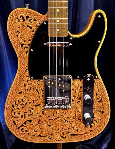 Miss Kitty is a beautiful Fender Squire that was a special commission. She's not available for sale, but we would be happy to carve you a body or build you a custom guitar. This design can be placed on most guitar body styles, however, if you choose a body style other than a Telecaster, there will be additional lead time to create the pattern.
